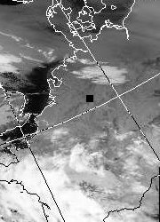 Satellitenbilder (Infrarot, Ausschnitt) aus der Nacht 08./09.11.2003, aufgenommen von NOAA 17 (1. & 2. Bild) bzw. NOAA 16 (3. & 4. Bild) um 20:02 UT, 21:42 UT, 02:44 UT & 03:26 UT. Das schwarze Quadrat markiert die ungefähre Lage von Bonn. Image courtesy to Dundee Satellite Receiving Station, Dundee University, Scotland.