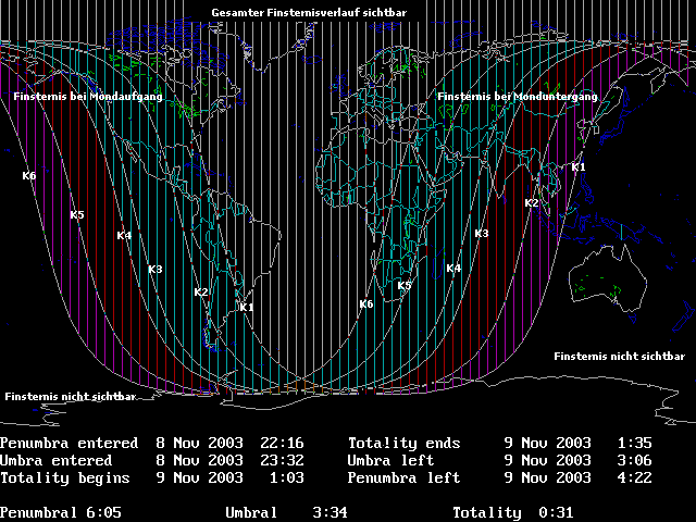 WO KONNTE MAN DIE MONDFINSTERNIS SEHEN?Die Mondfinsternis am 09.11.2003 war im gesamten deutschsprachigen Raum in voller Länge sichtbar. Für einen Ort 50° nördlicher Breite und 10° östlicher Länge ging der Mond am Morgen des 09.11.2003 erst 2 Stunden nach dem 6. Kontakt (= Ende der Halbschattenfinsternis) unter. Die totale Verfinsterung trat bei einer Horizonthöhe des Mondes von fast 50° ein; bei klarem Himmel war also mit optimalen Beobachtungsbedingungen zu rechnen.